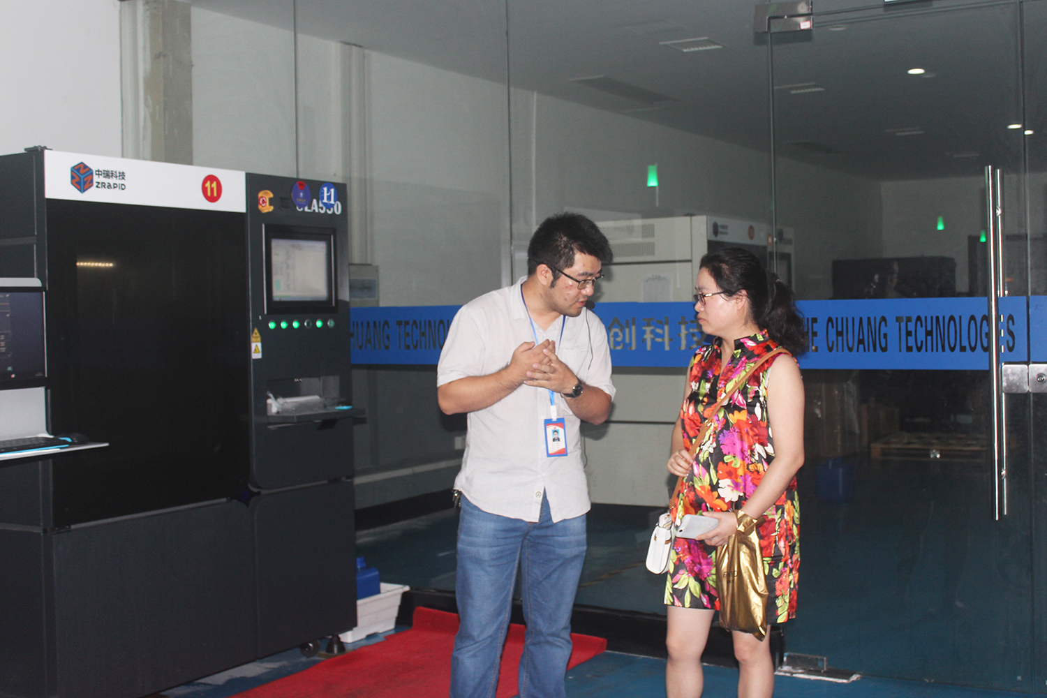 隨后,參訪領導一行參觀了生產車間,對浙創科技的技術力量、機械設備、產品研發進行了了解。在浙創科技的樣品間,陶總親自向參訪領導介紹了公司與浙大聯合研發的光敏樹脂,以及光敏樹脂打印出的產品,并通過幾個典型的3D打印模型,具象的介紹了3D打印的優點。