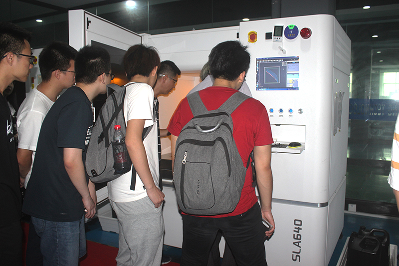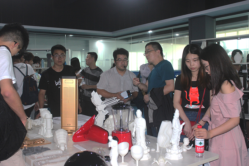 在樣品間,琳瑯滿目的展品引起了浙大師生強烈興趣和反響。陶總結合3D打印模型向浙大師生一行介紹了3D打印的成型方式及各種材料。3D打印車間內工作中的3D打印設備則讓浙大師生一行更直觀的了解了3D打印的成型原理。