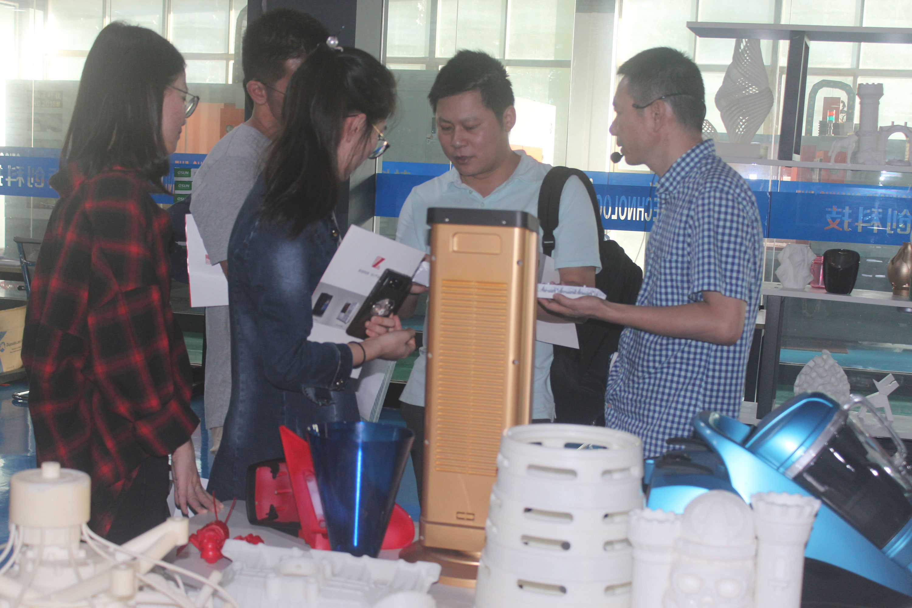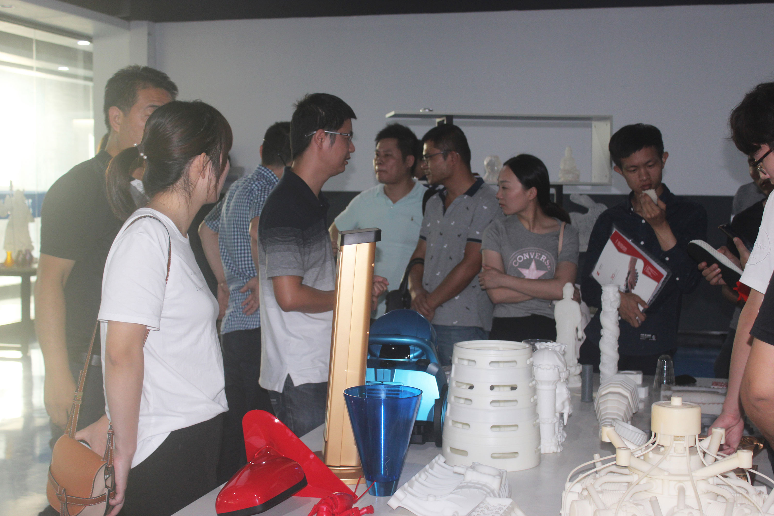 在陶董事長等浙創科技領導的陪同下,來訪嘉賓一行參觀了3D打印車間,詳細了解了SLA工業級3D打印機打印流程,觀察SLA成型方式。在3D打印樣品間,陶董事長和陶總經理向來訪嘉賓展示了3D打印的各種模型,來訪嘉賓對優質的家電和汽車配件模型表現出了濃厚的興趣,并就模型生成的整個過程向浙創科技工作人員進行了詳細的詢問。