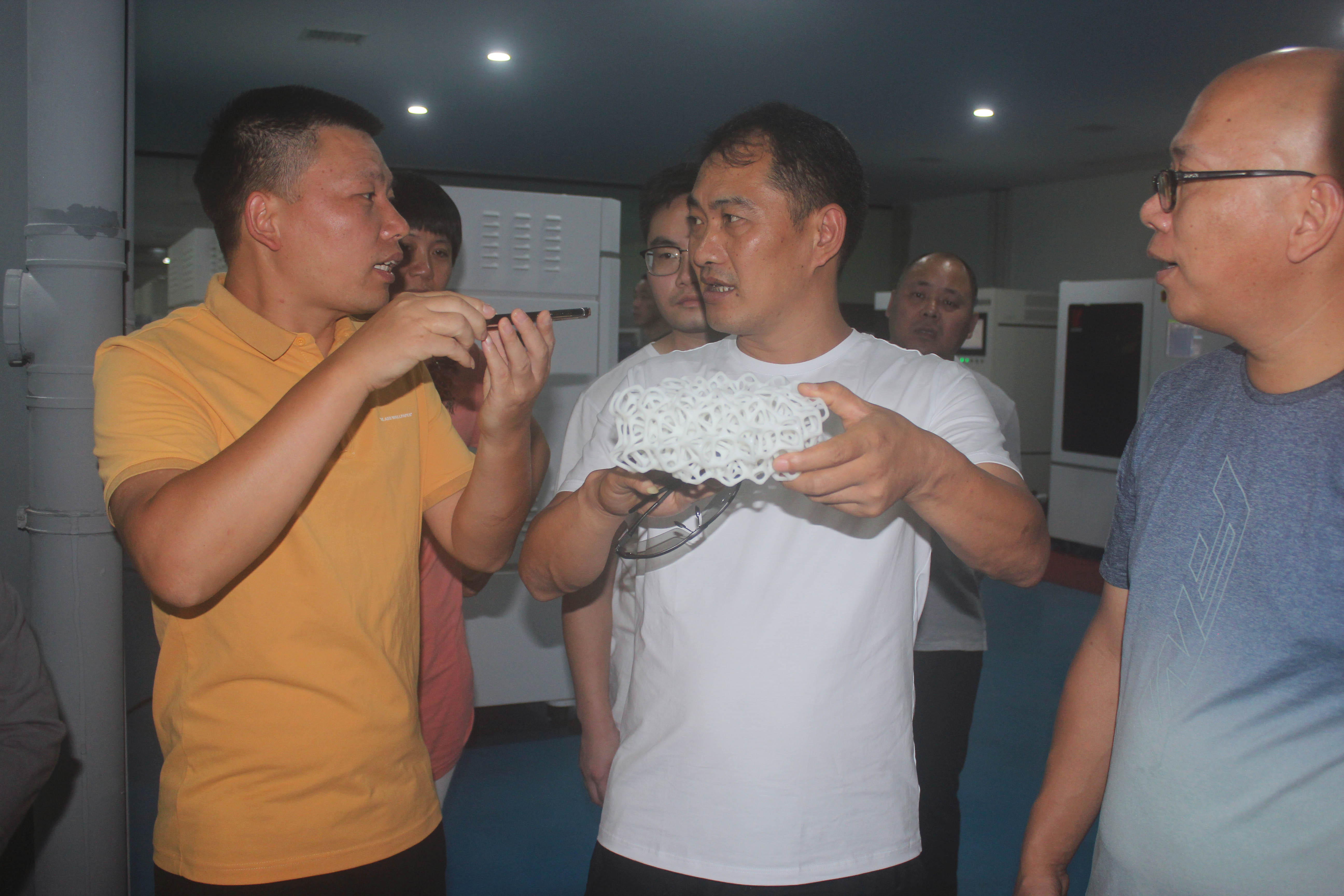 隨后帶領大家一一參觀了3D打印車間與樣品間。3D打印車間的參觀引起了學員們濃烈的興趣,多臺3D打印設備正在運行,陪同的公司領導們向大家介紹了3D打印設備的亮點、設備的運行原理和正在打印的樣件,大家紛紛駐足觀看現場打印效果,我司領導隆重介紹了我司自主研發的SLA 3D打印機自動化程度高、操作簡單,打印產品成本低、形狀多樣、色彩豐富、耗材環保無污染,發展優勢明顯等,學員們頻頻點頭表示贊嘆。